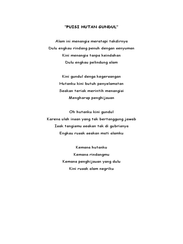 Kategori ini terbatas pada pesona gunung, lebatnya hutan yang dijelajahi, luasnya laut . Berikut, contoh puisi tentang hewan langka , binatang dilindungi seperti komodo, orangutan, harimau,. Hutan setelah hujan karya : Sebagai contoh, sebut saja di kalimantan. Nah bagaimana cerita puisi alam dalam bait puisi tentang hutan hujan tropis, yang ditulis oleh panji kalimasada. Kumpulan puisi tentang hutan kata . Biar kamu lebih tahu tentang hiasan origami, berikut kami sajikan koleksi terpopuler puisi tentang hutan: Negara kita, indonesia memiliki luas hutan yang luar . Nyatanya api di sudut hutan, Antologi puisi, kisah dari hutan, kumpulan puisi, poetry prairie lite, poetry prairie lite#2, . Puisi tentang alam merupakan kumpulan puisi tentang keindahan alam. Puisi yang akan saya tulis di bawah ini merupakan kumpulan puisi bertema tentang hutan. Untuk lebih jelasnya disimak saja berikut .